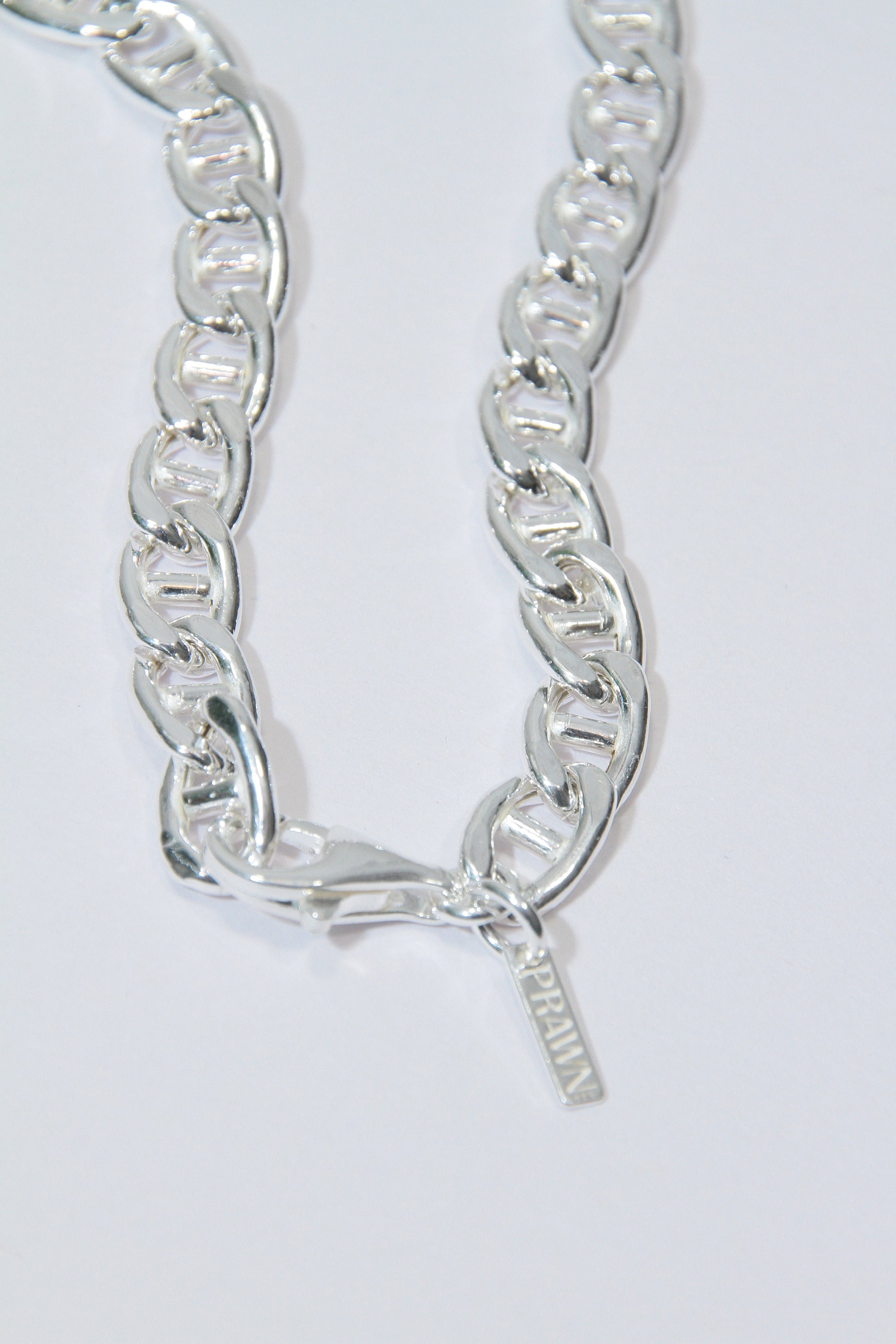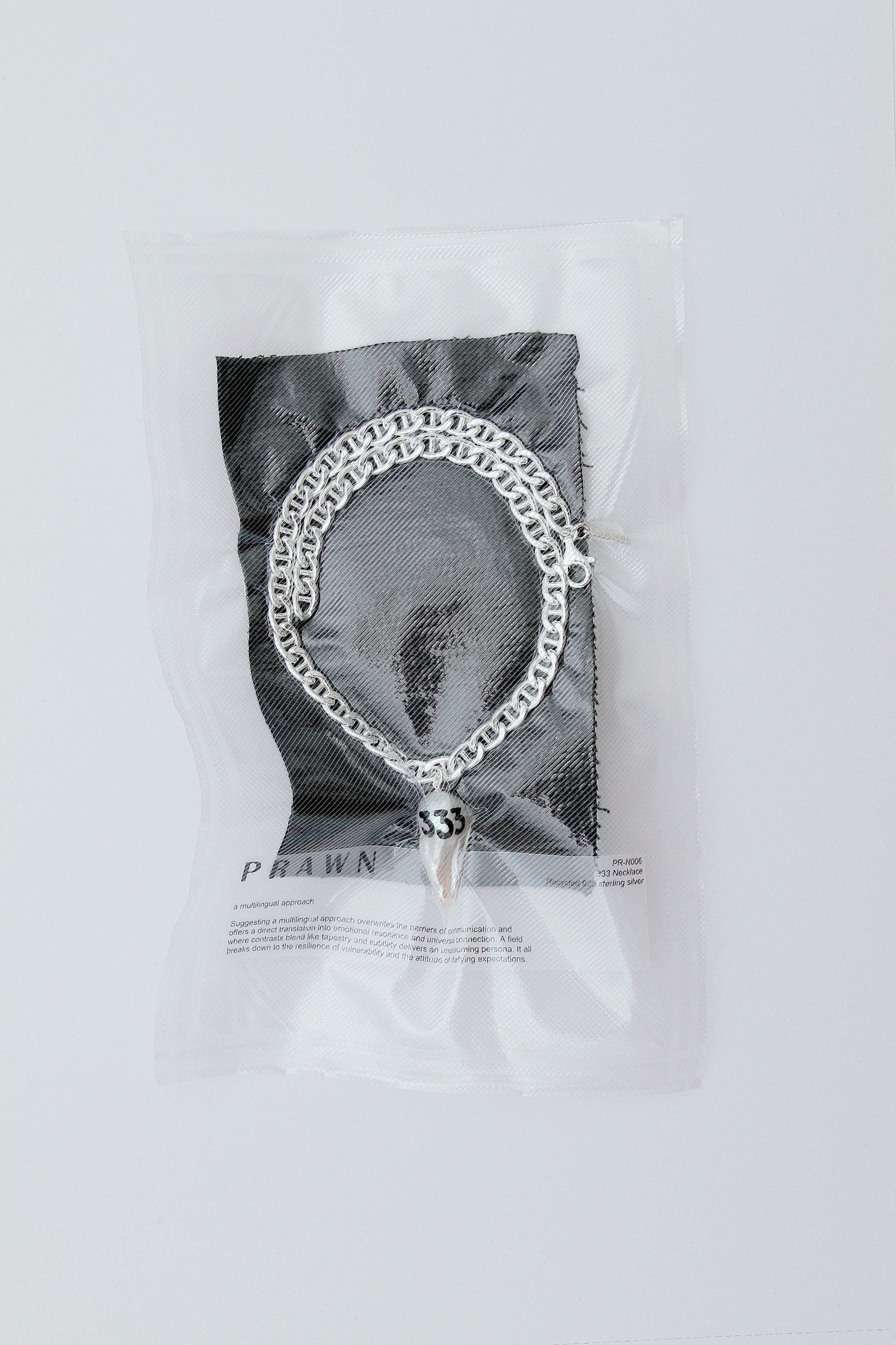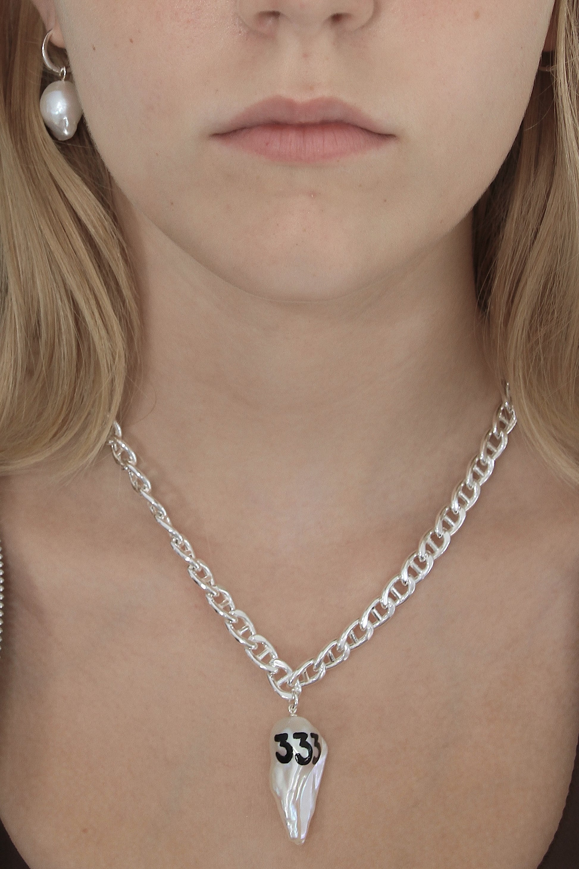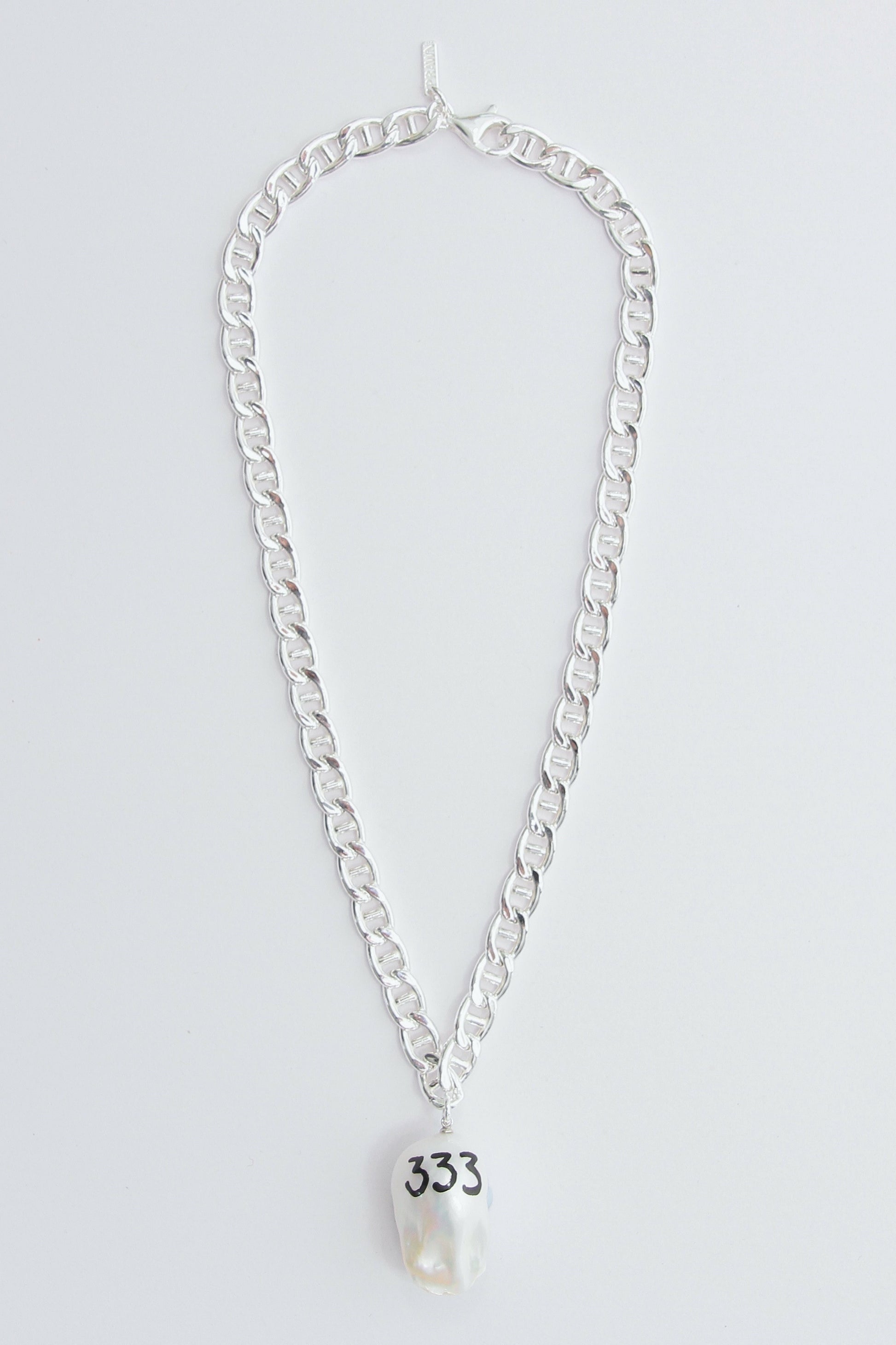 Utilising hollow-form Mariner links made from recycled 925 sterling silver, the design is a study in calibrated hardware. The hand-engraved and hand-painted 333 motif on a natural freshwater pearl ensures that each specimen carries its own individual character.