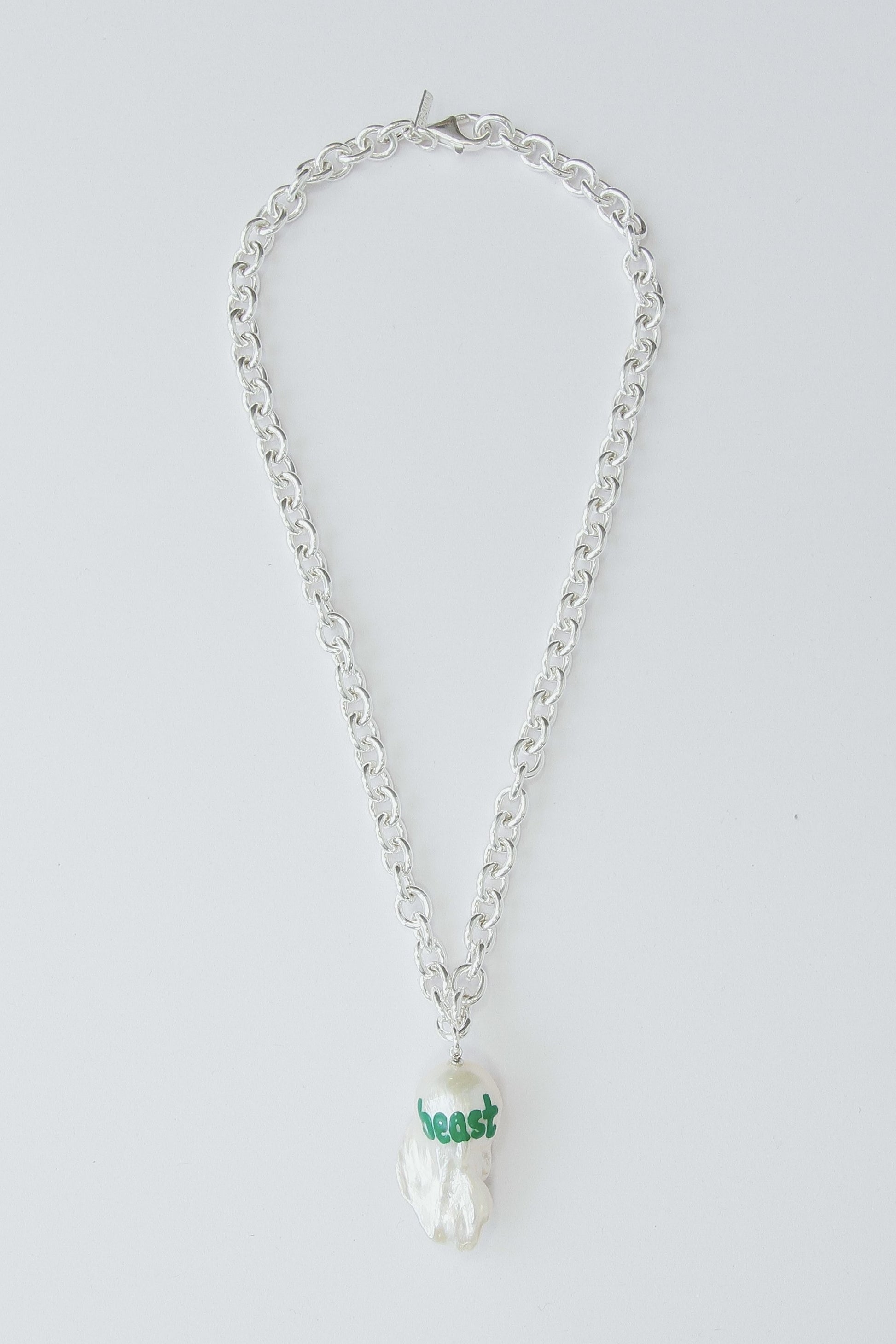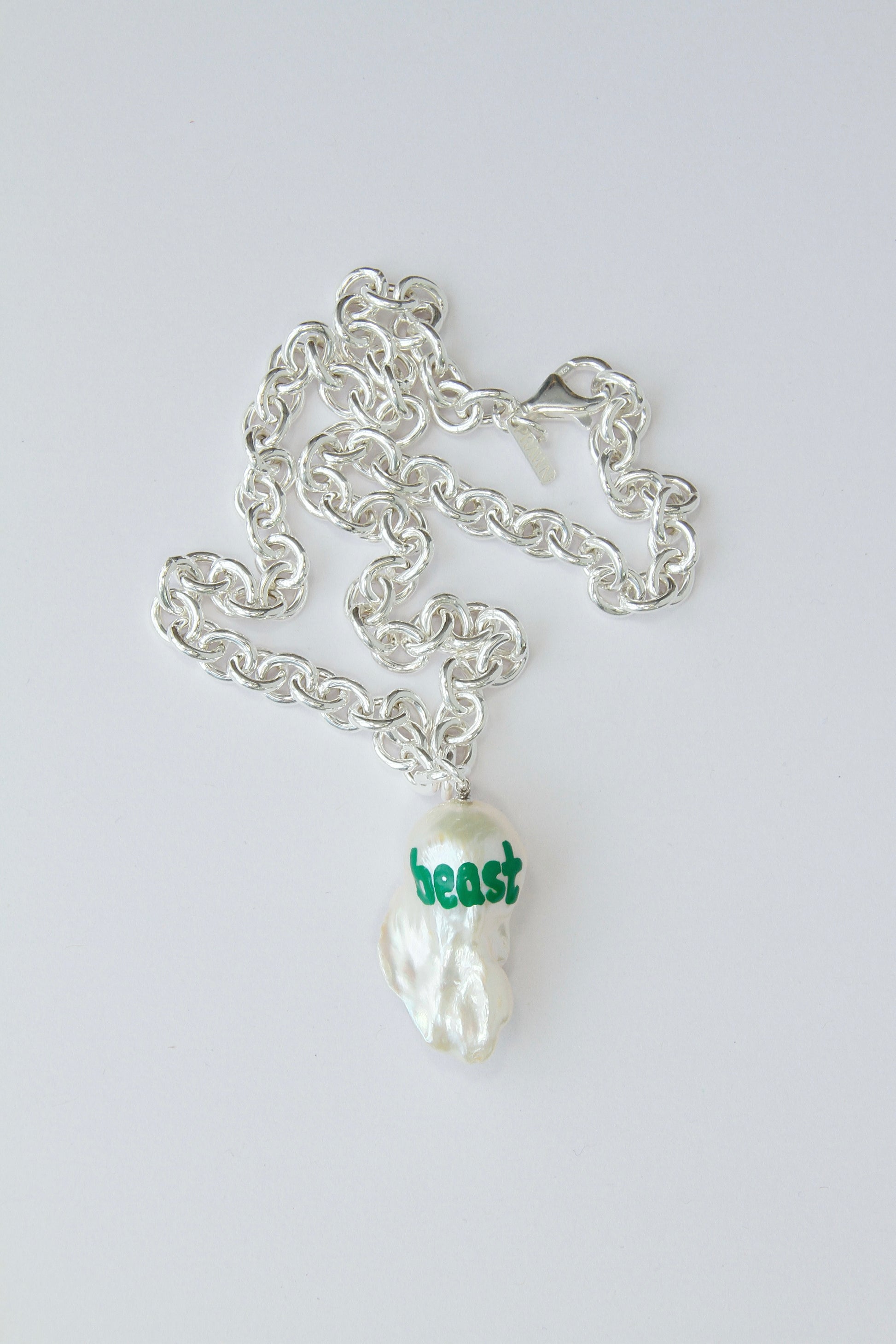 Materials: Recycled 925 sterling silverwith an anti-tarnish protective coating; natural, baroque freshwater pearl; green cold enamel