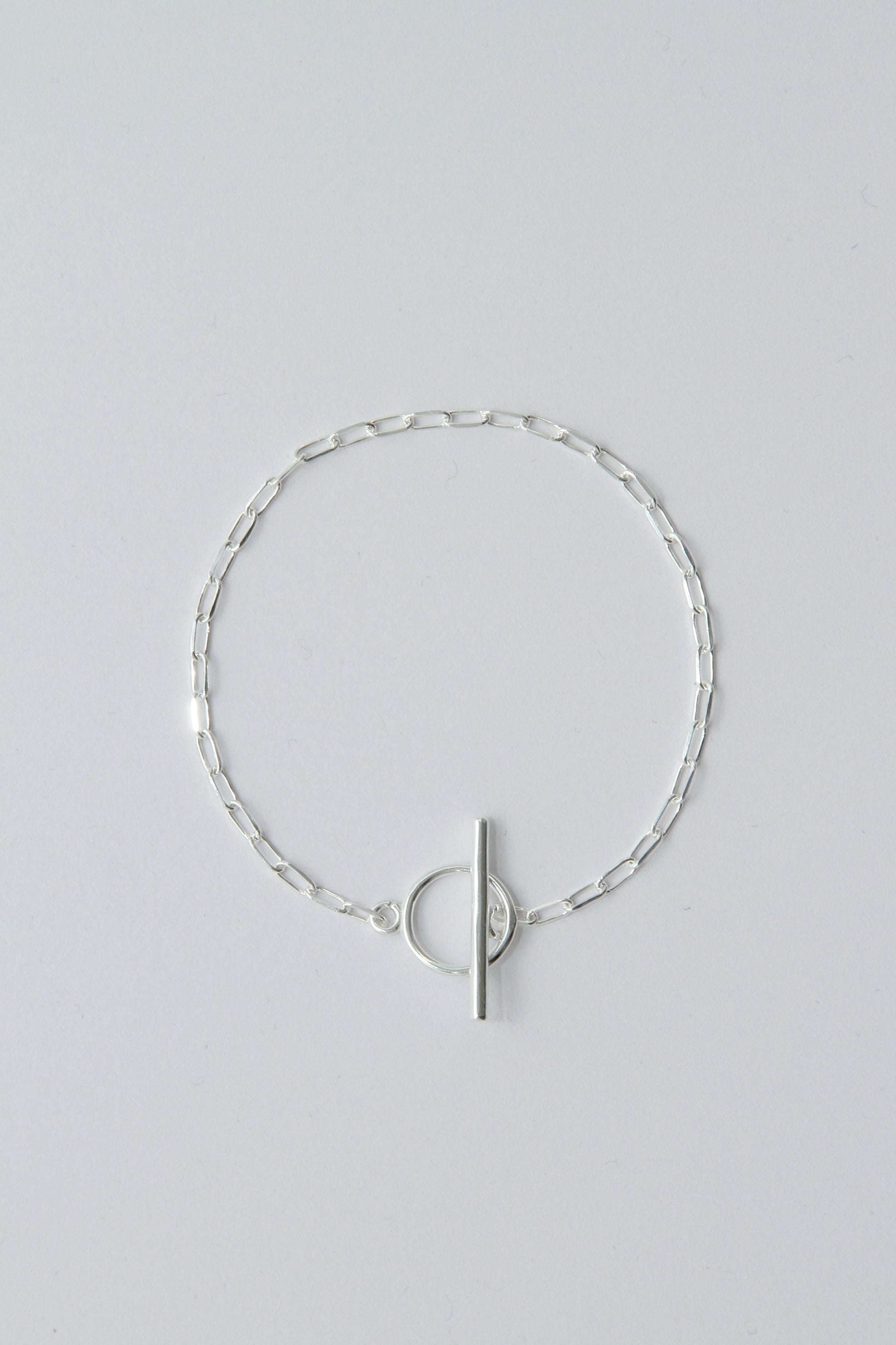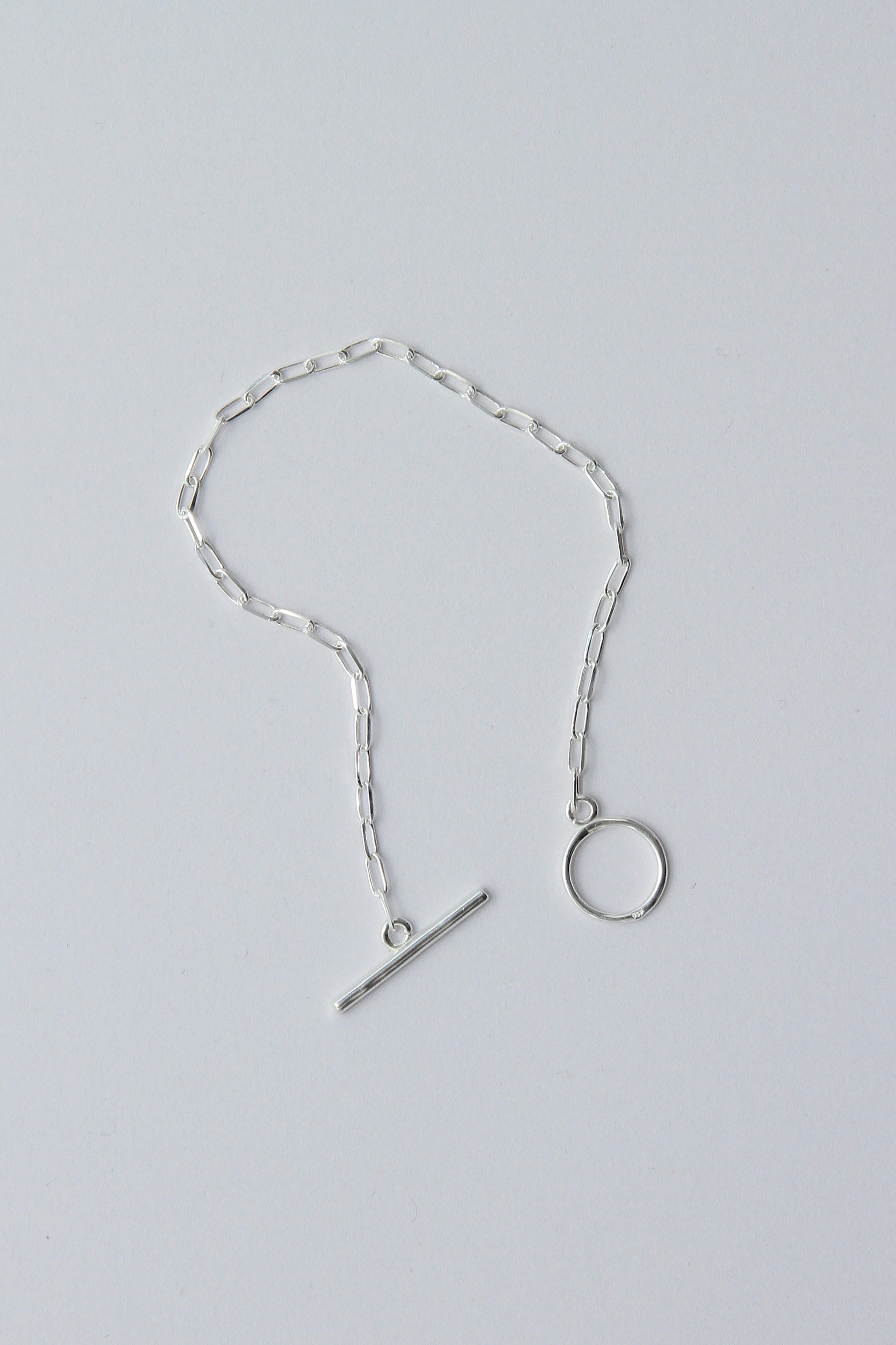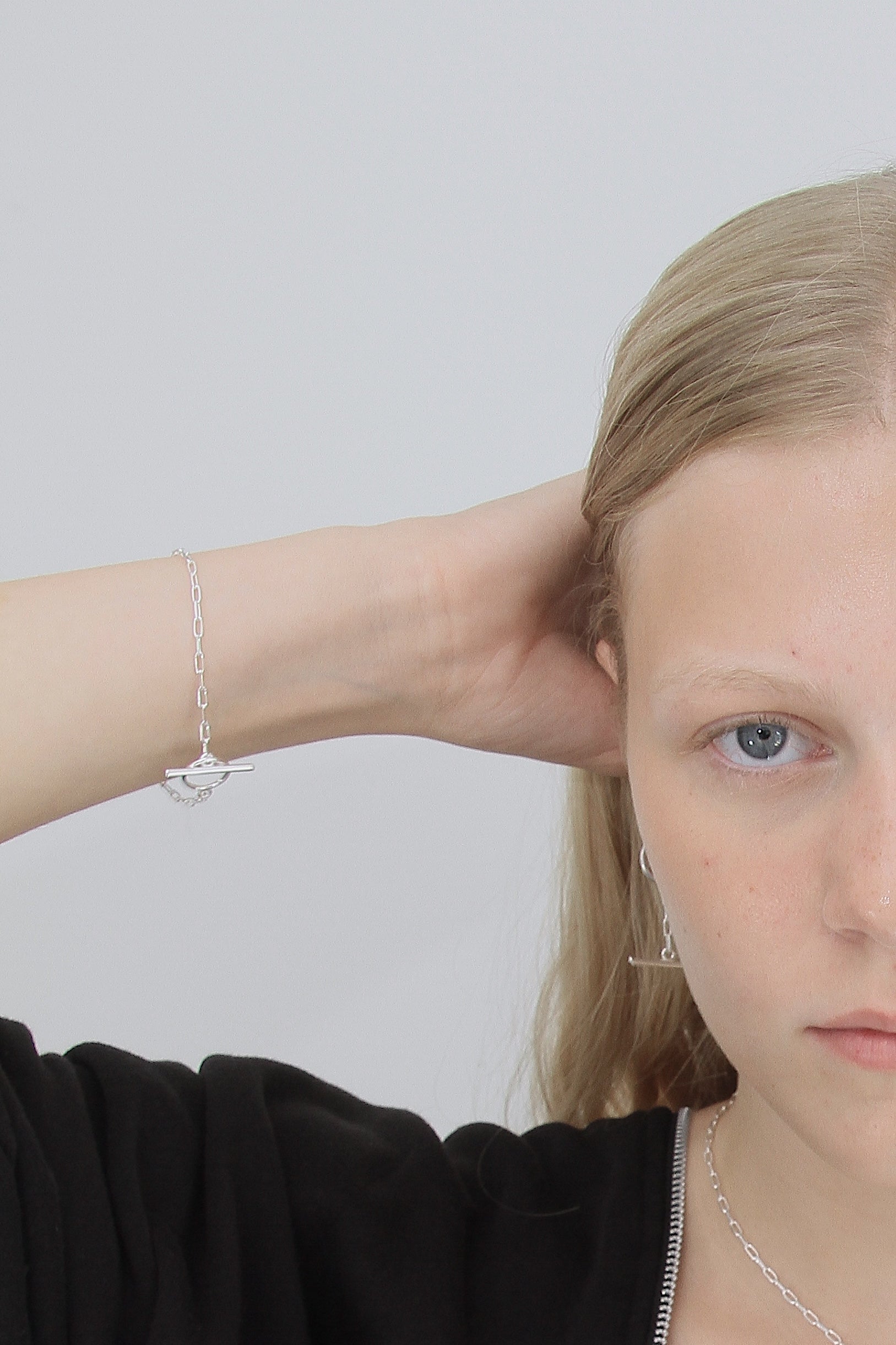 The design features a thin chain with elongated linear links that transition into a disproportionately oversized T-bar clasp, acting as the gravitational anchor. This intentional shift in scale elevates the closing mechanism from a hidden utility into a primary architectural node.