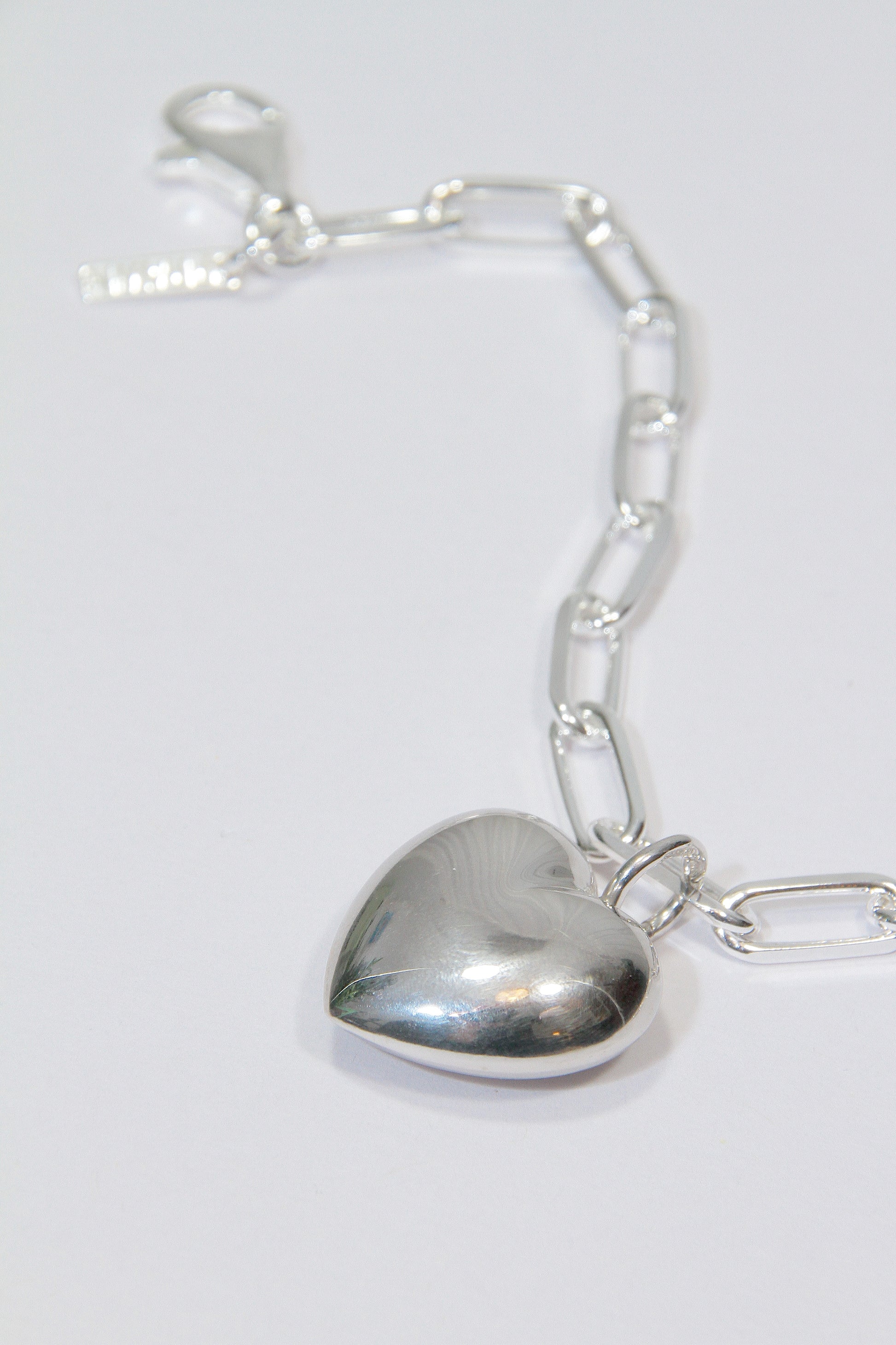 Cast in heavy-gauge recycled 925 sterling silver, the design strikes a deliberate tension between the geometric rectangular links and the soft curves of the heart.