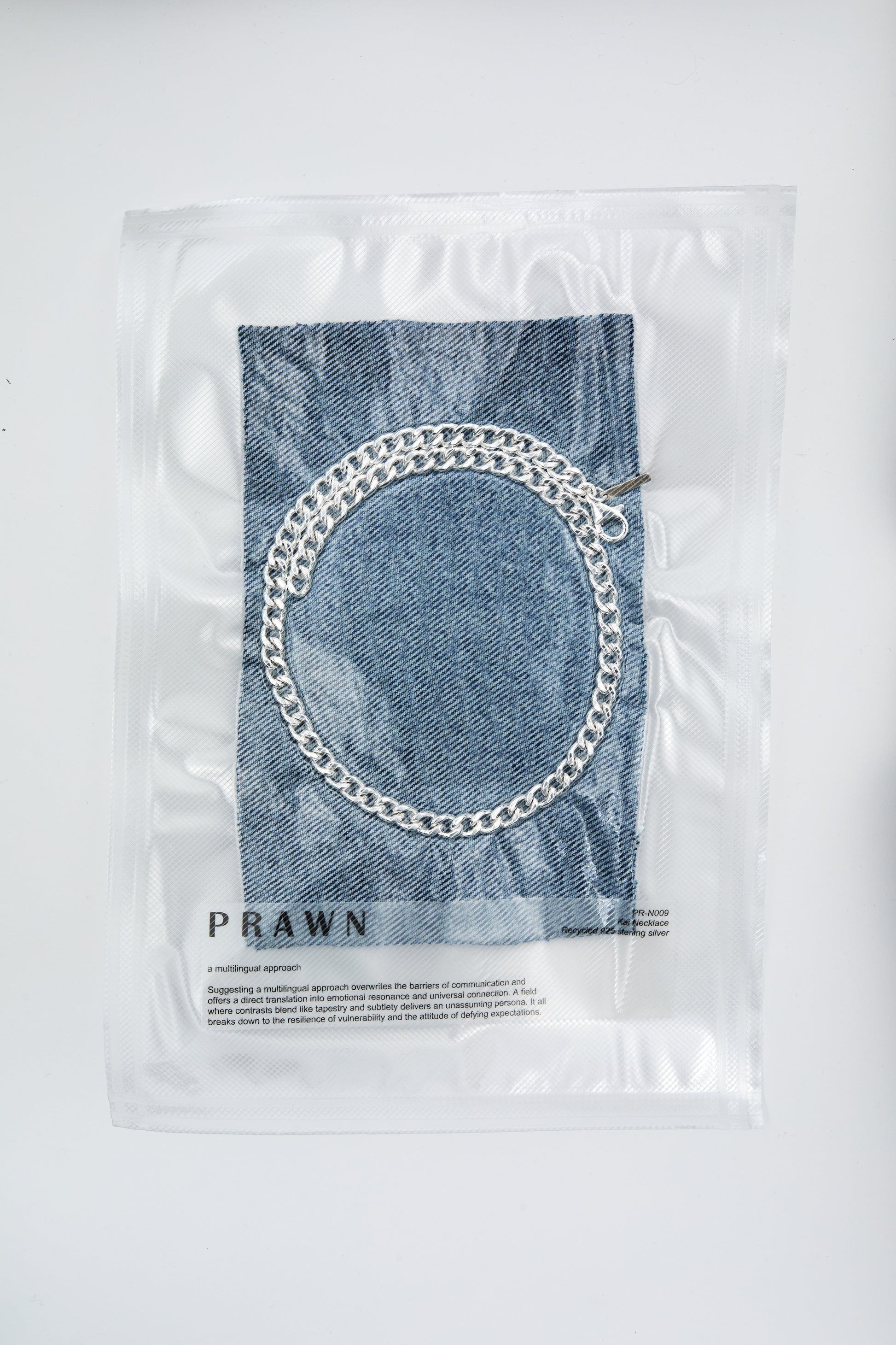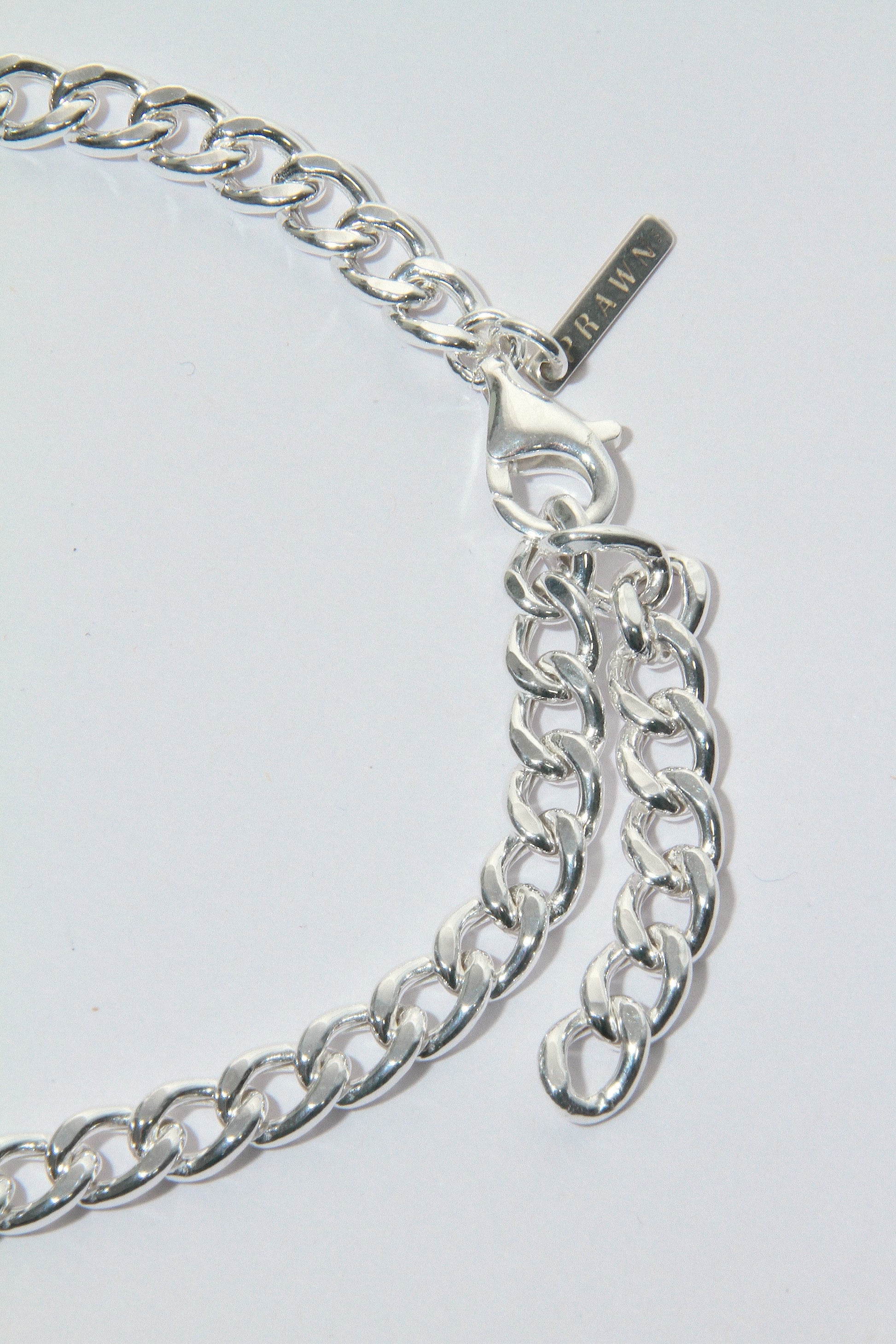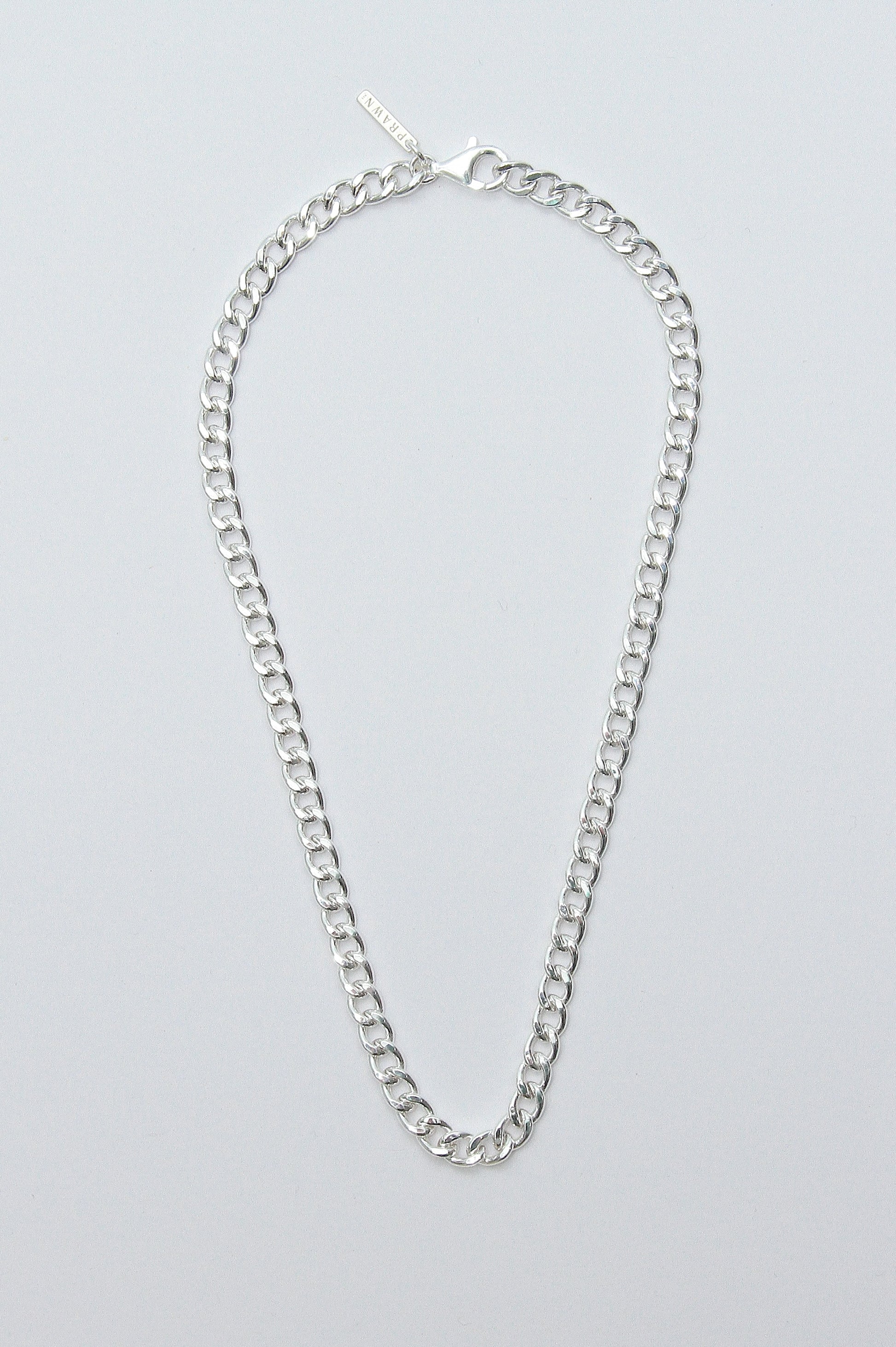 The KAI NECKLACE is a technical manifestation of consecutive radial geometry. Constructed from recycled 925 sterling silver, the profile is defined by 7 mm interlocking curb links with a rounded silhouette that creates a fluid path of tension.