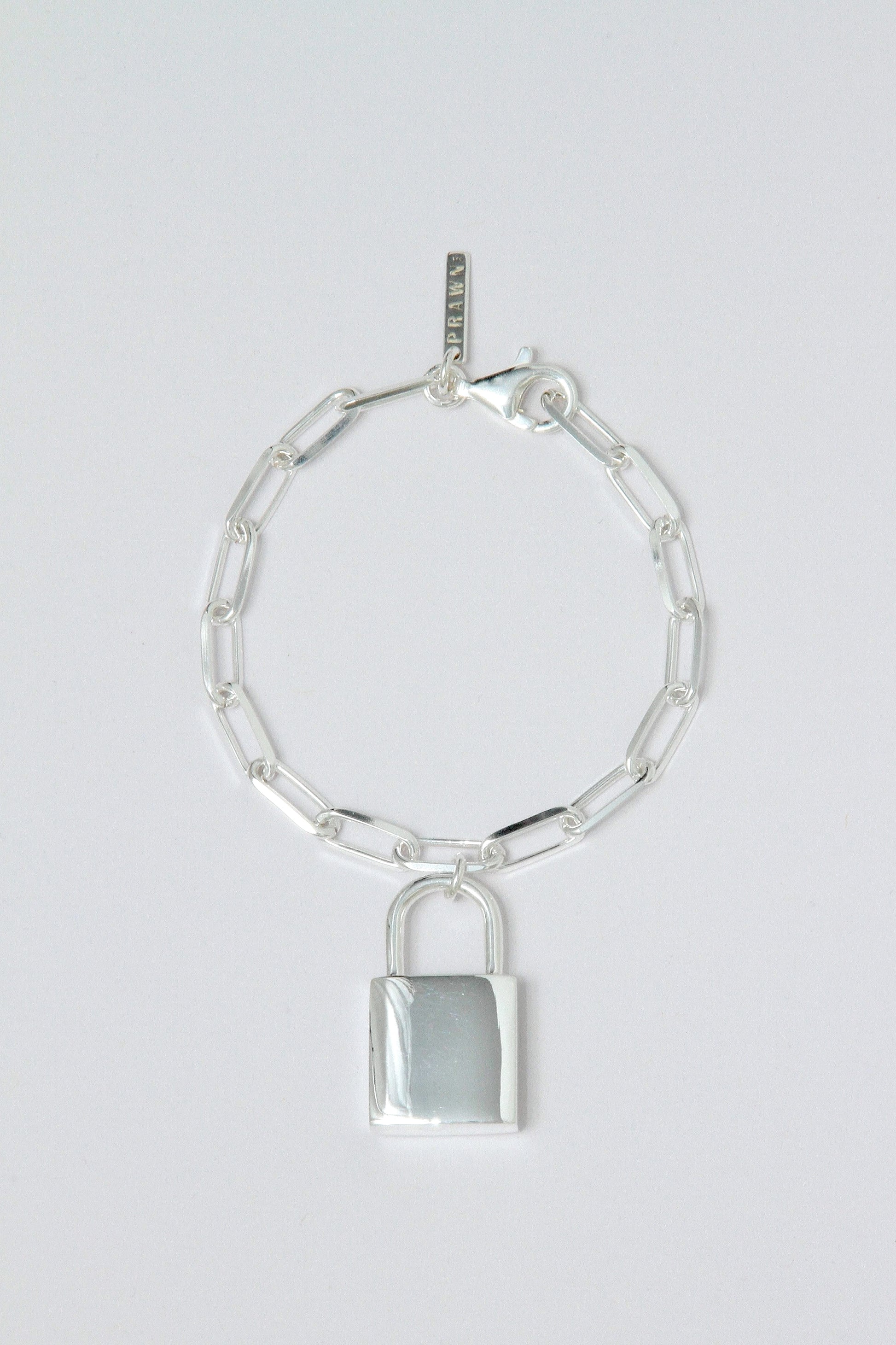 The PADLOCK BRACELET is defined by the oversized, inflated form of its primary focal point contrasting the geometric precision of the rectangular chain.